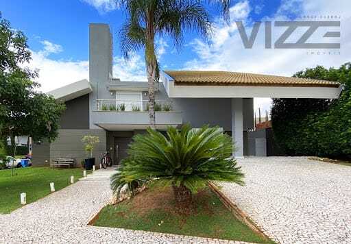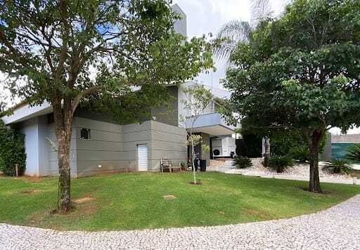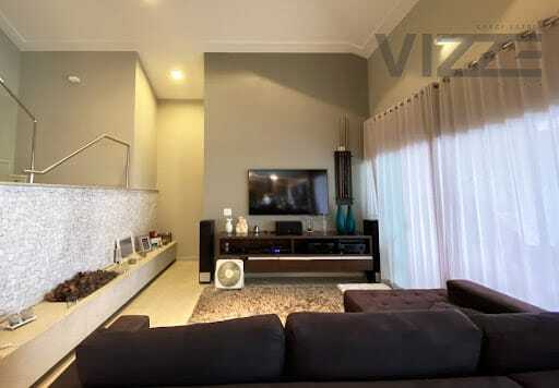 No piso térreo o imóvel dispõe de: Garagem coberta para 02 carros, sala de estar e jantar integradas com lareira à gás, cozinha americana, área gourmet com sistema de som, Sala de TV/reversível para apartamento com ar condicionado, lavabo, dispensa, área de serviço, 2 depósitos, banheiro para piscina.No piso superior: sala de Tv com ar condicionado, suíte máster com hidromassagem e pia com cubra dupla e 02 apartamentos, todos com ar condicionado. Projeto Atual e sofisticado com fino acabamento - Espaçosa área de lazer com Churrasqueira moderna e revestida - Revestimento em porcelanato - Pintura semi-brilho no interior e textura no exterior - Projeto luminotécnico com lâmpadas LED - Preparo para instalação de ar-condicionado nos quartos e salas – Infraestrutura para CEF – TV - persianas em alumínio, aquecimento solar para água, piscina aquecida com raia.Linda vista para o lago do condomínio