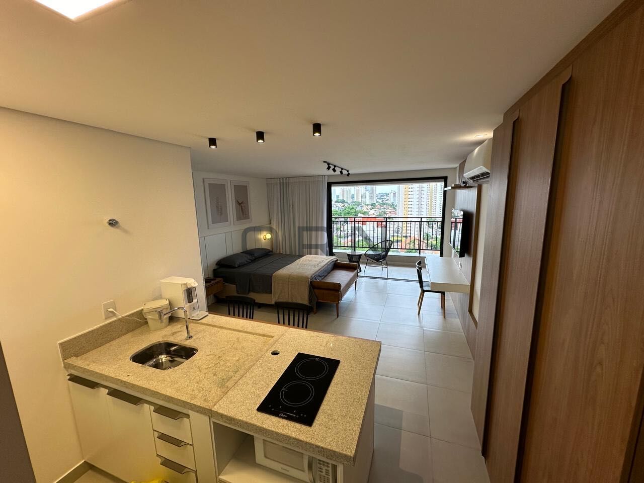 Studio muito bem localizado, completo em decoracao, mobília, enxoval, eletrodomésticos, ar-condicionado e tv, pronto pra morar ou locação.