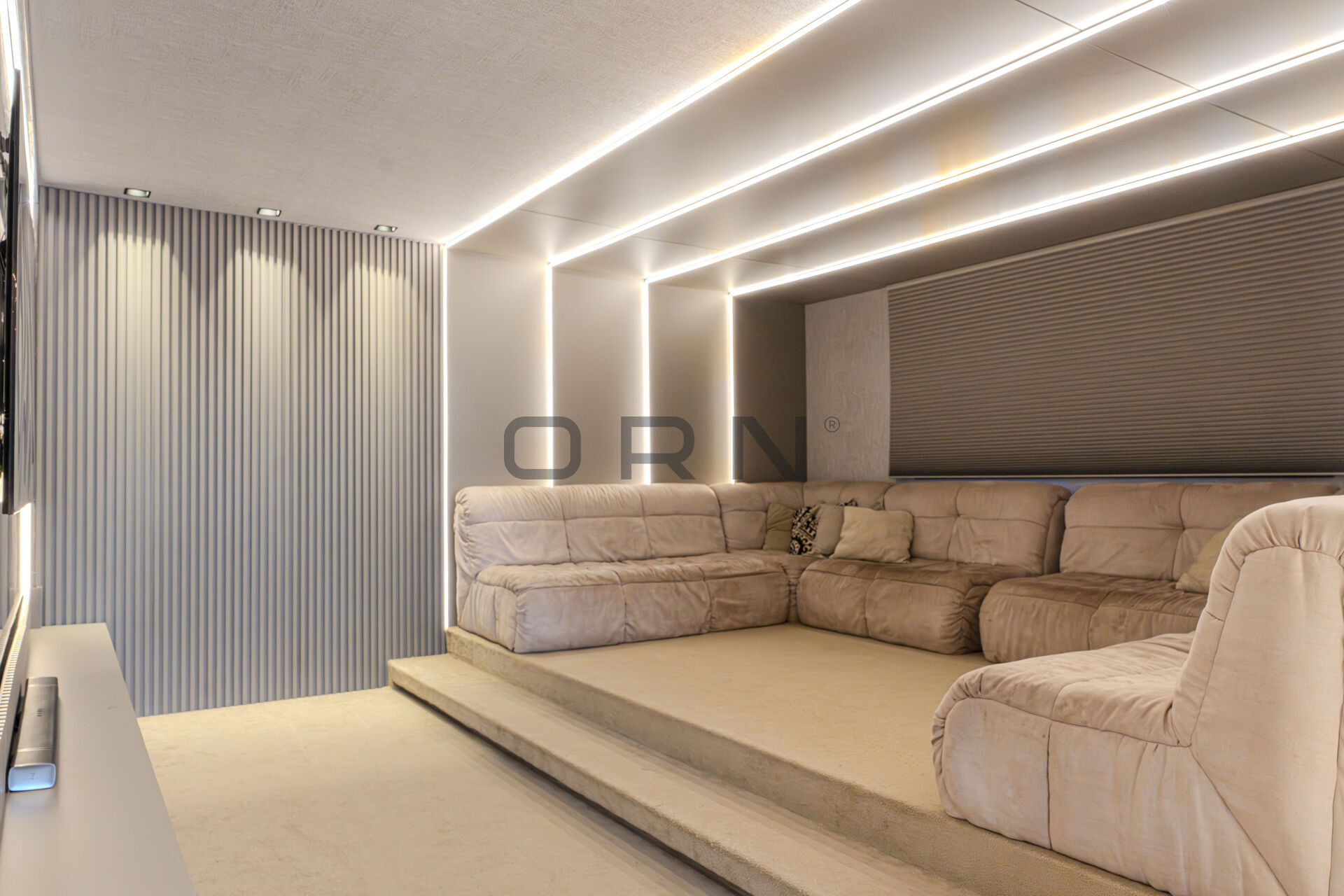 A área social é composta por salas de estar e jantar integradas, além de uma aconchegante sala de cinema. A cozinha planejada conecta-se ao amplo espaço gourmet, que conta ainda com uma charmosa sala de TV, criando o ambiente ideal para receber com requinte.
